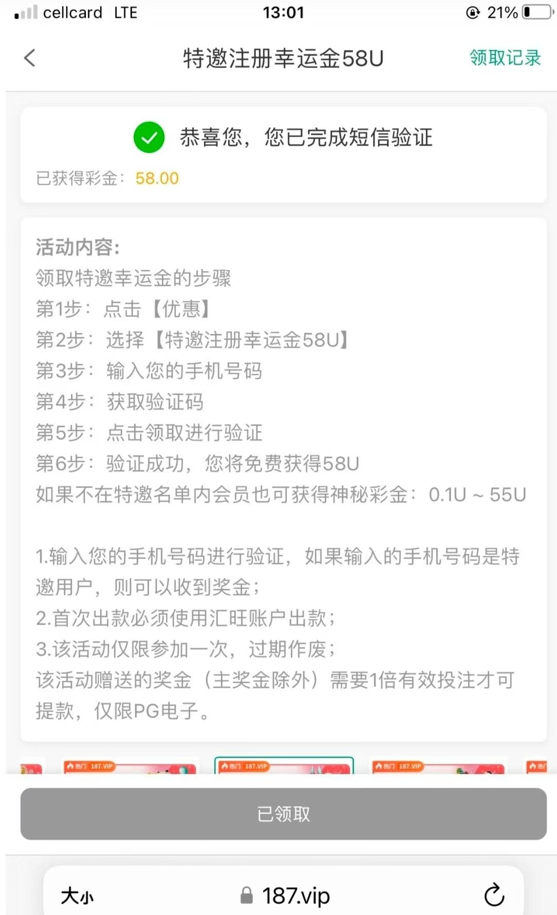 然后我验证了一下号码领到58u,得吃500u