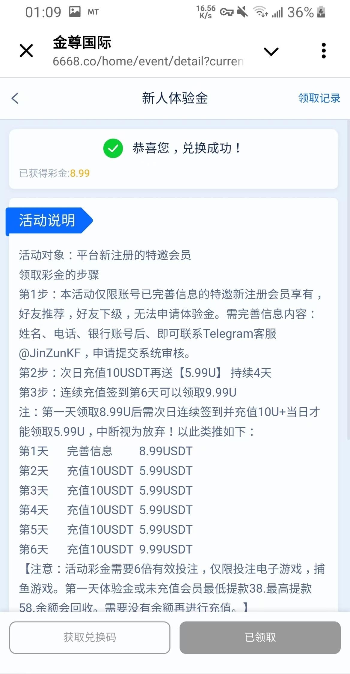 有汇旺的去,绑定手机号和汇旺,汇旺不需要流水。联系飞机客服@JinZunKF 申请。审核通过了会给你一个兑换码。就说在一个频道看到的广告,但是现在看不到了。我领到了没有打出来,请勿充值