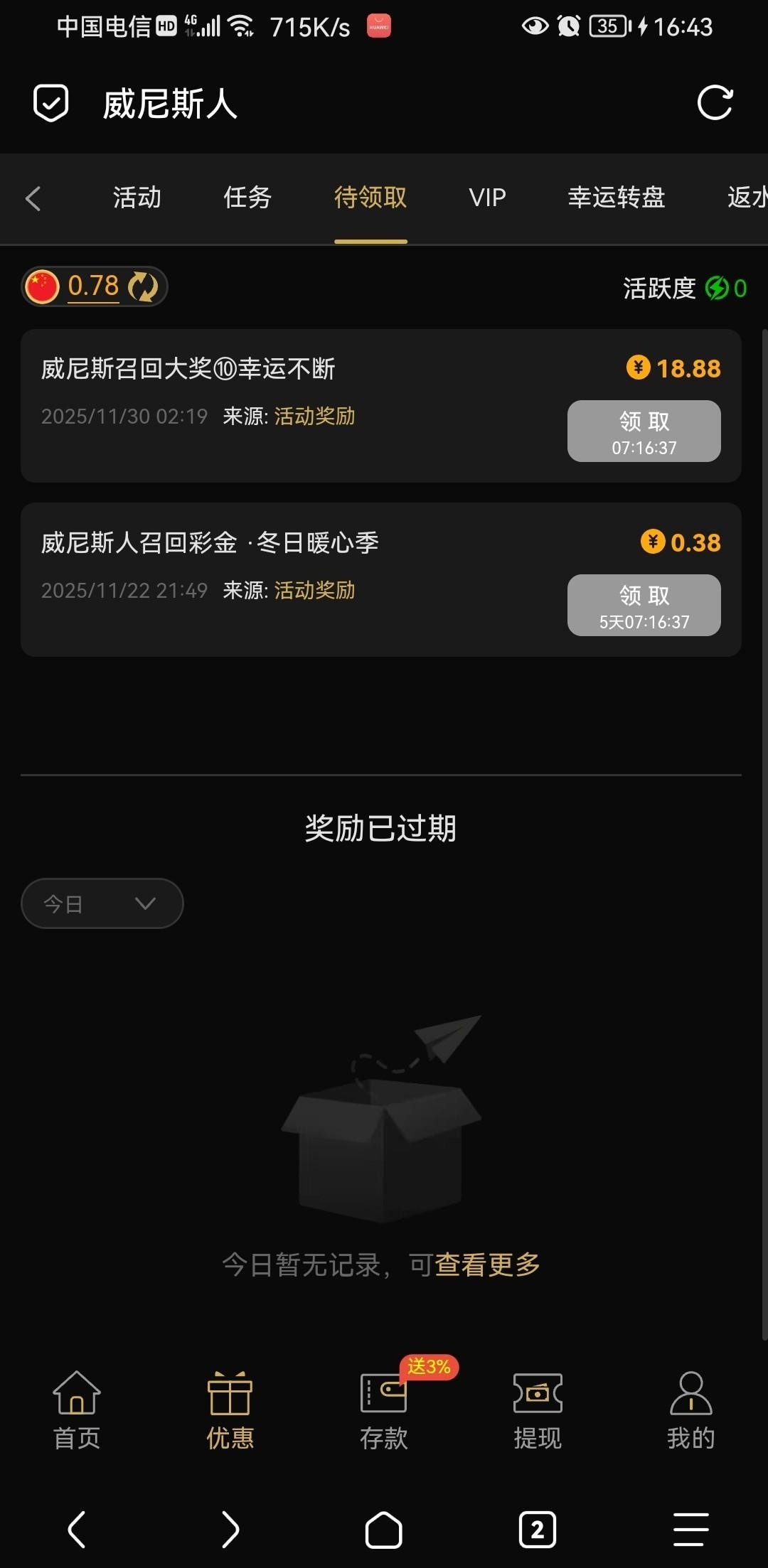 不知道是否需要充值过,我两个台几个月没有充值了,2号可领。