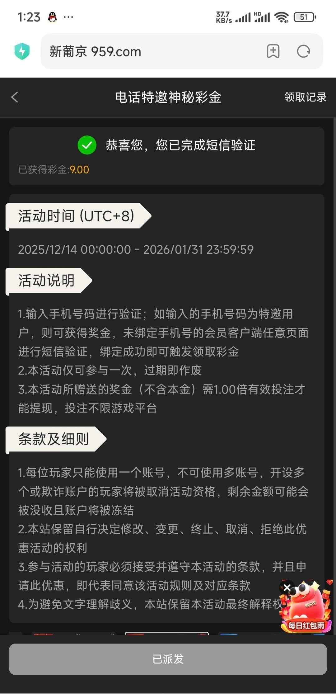 电话彩金送9还行,有点水用手机号注册就自动送了