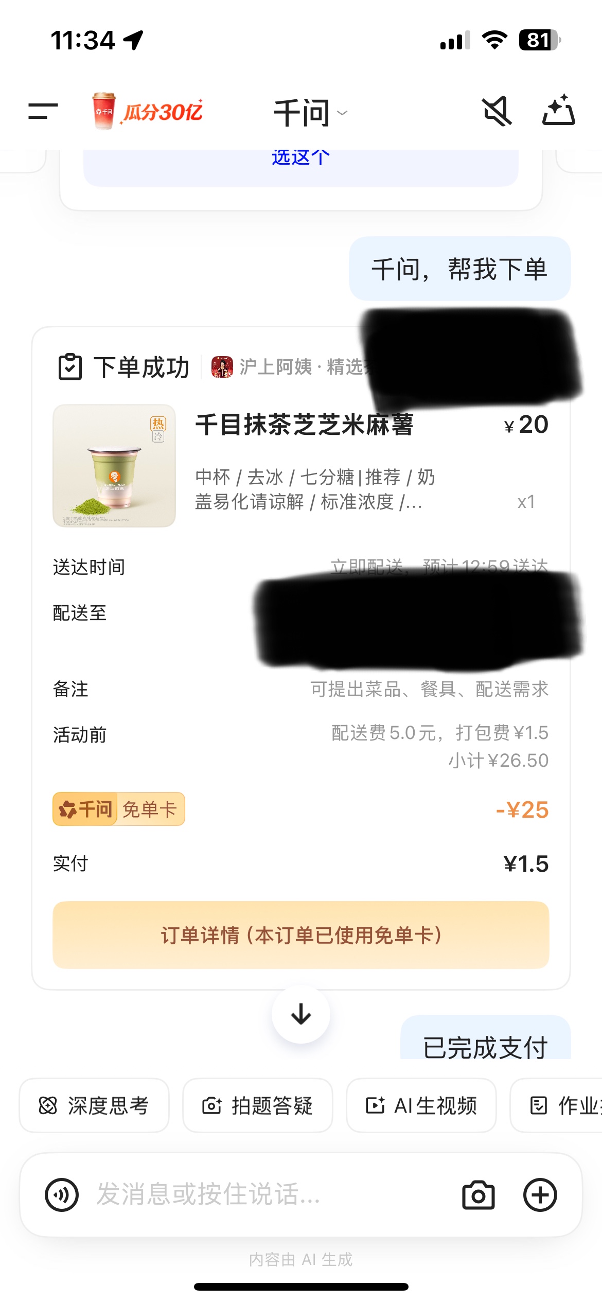 千问白嫖奶茶外卖